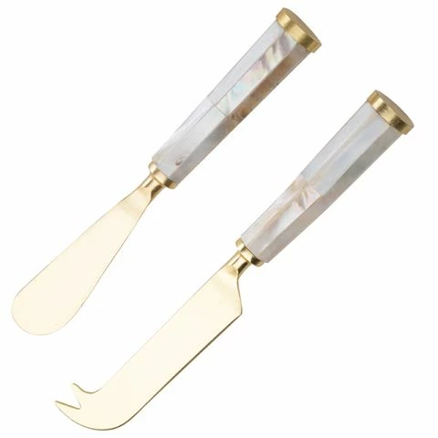 The Mother of Pearl Gold Cheese Set 2pce is the perfect way to add some style and sophistication to your dining collection. Made from metal with a gold toned finish, and enhanced with a mother of pearl handle design, this set will take cheese tasting to another level.